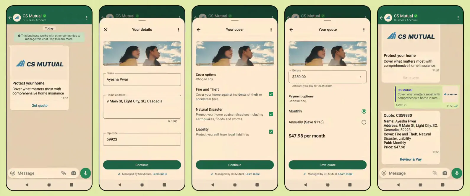 Veja a seguir o exemplo de uma jornada de cotação no WhatsApp Flows: