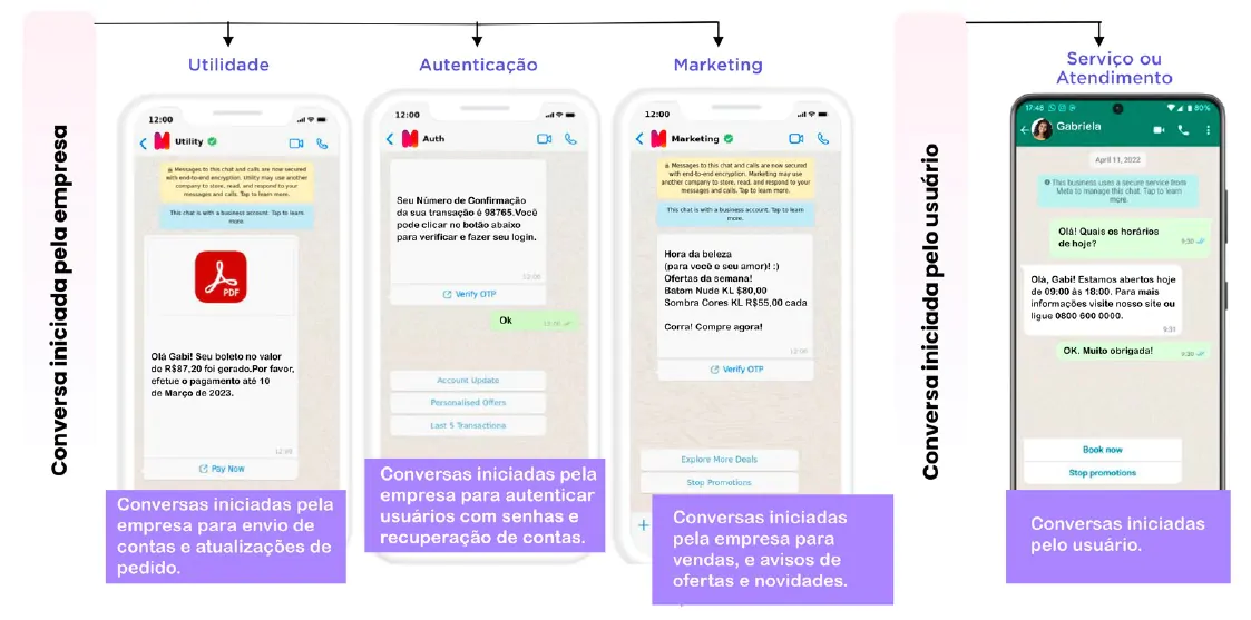 As empresas que usam a Plataforma do WhatsApp Business serão cobradas por conversas de 24 horas com diferentes taxas por categoria. As conversas iniciadas pela empresa atuais serão divididas em três novas categorias: utilidade, autenticação e marketing. As conversas iniciadas pelo usuário serão chamadas de conversas de serviço.