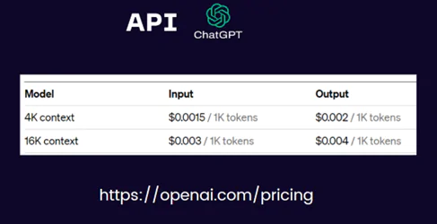 O uso da API do ChatGPT tem um custo que é cobrado diretamente pelo próprio ChatGPT. Você precisa ter um cadastro no ChatGPT e um cartão de crédito para pagar as consultas que fizer. Cada consulta é cobrada por token, que é uma unidade de medida que corresponde a aproximadamente uma palavra ou a cada 1000 tokens, você tem 750 palavras. Por exemplo, se você consumir 750 palavras, você está pagando 1k de tokens. E o valor de cada 1k de token é definido pela OpenAI, conforme a tabela abaixo.