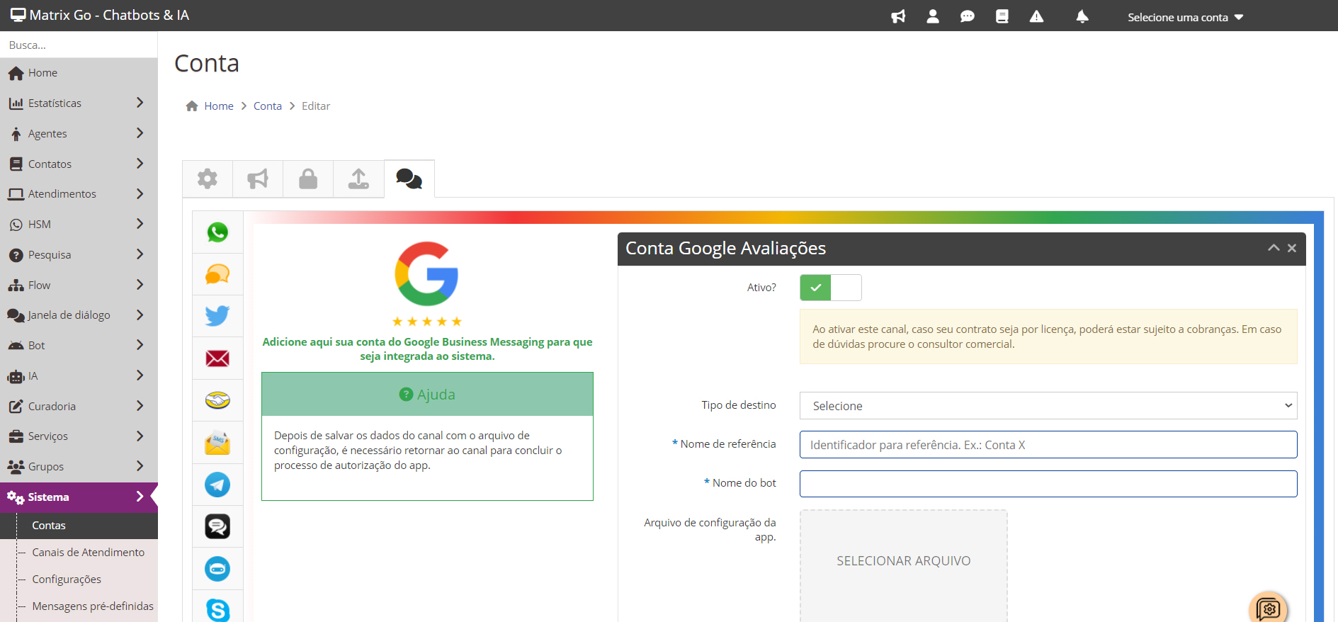 Para ativar o Google Avaliação no Chatbots & IA, vá ao menu Sistemas, e depois em Contas. Selecione Editar Conta. Na aba Canais de Atendimento, selecione Google Avaliações.
