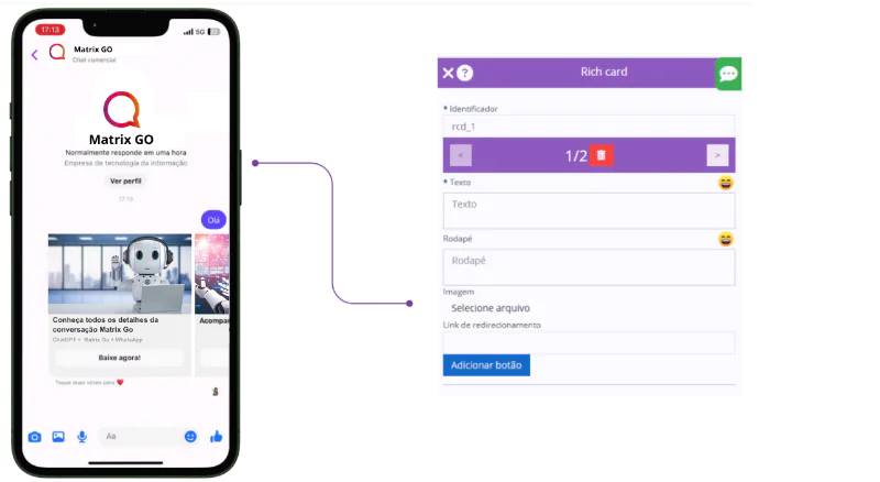 É simples! Acessando o Chatbots & IA da Matrix Go; dentro do componente Rich Cards no fluxo, você encontrará campos para adicionar texto (que acompanhará cada cartão), um campo para adicionar rodapé (onde é possível incluir uma descrição extra), selecionar uma imagem e especificar um link de redirecionamento para onde o usuário será encaminhado ao clicar no cartão.