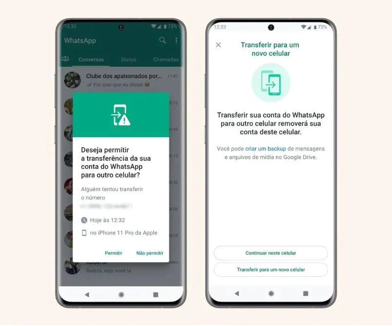 O alerta exibirá o horário e o modelo de celular em que foi realizada a tentativa de transferência será mostrado ao usuário. O aplicativo informará que a transferência remove totalmente a conta do celular antigo, cabendo a permissão ou não da migração.