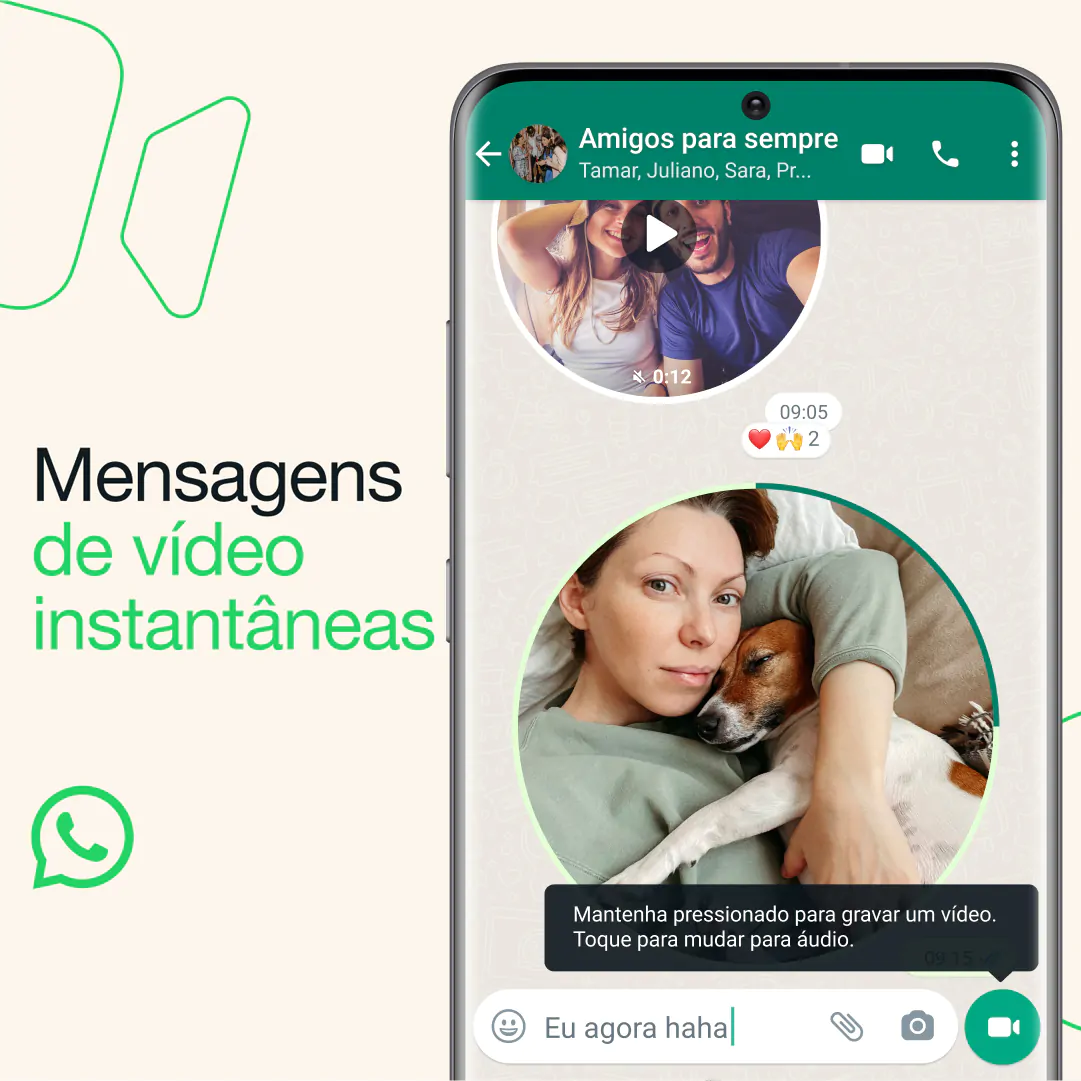 O WhatsApp trouxe mais uma novidade para você se comunicar com mais facilidade e segurança: as mensagens de vídeo instantâneas. Agora você pode enviar vídeos curtos e pessoais direto na conversa.